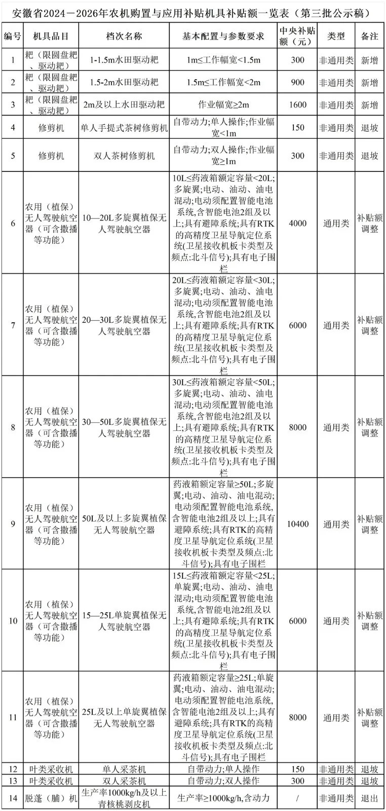 安徽省農(nóng)業(yè)農(nóng)村廳關(guān)于2024-2026年農(nóng)機(jī)購(gòu)置與應(yīng)用補(bǔ)貼機(jī)具補(bǔ)貼額一覽表(第三批)的公示