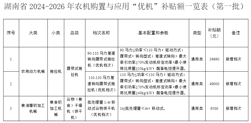 1、對技術先進、性能可靠、智能化程度高,或能解決丘陵山區(qū)“無機可用”問題的機具,認定為“優(yōu)機”,補貼額度最高可提升至40%。單機補貼限額按照2024-2026年農(nóng)機購置與應用補貼政策相關規(guī)定執(zhí)行。先行選擇履帶拖拉機和移動式烘干機作為優(yōu)機優(yōu)補機具,后續(xù)根據(jù)實施情況適當增加優(yōu)機優(yōu)補機具種類。詳情見下表: